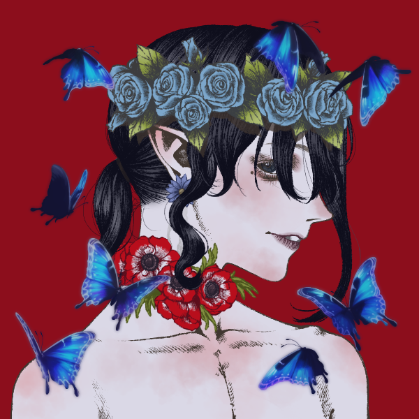 花,蝴蝶,少年,红色,蓝色,黑色。