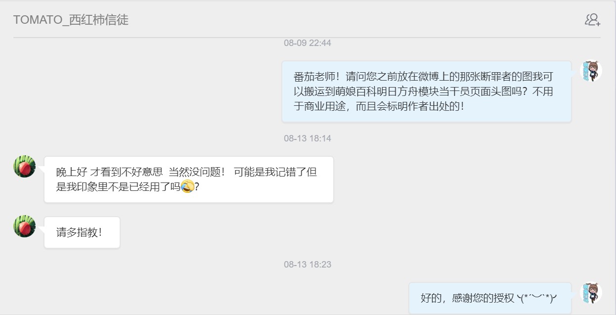| TOMATO | TOMATO的授权图 | 目前仅授权搬运一张与干员断罪者有关的图片,已设为该页面的头图。日后如有番茄老师绘制的《明日方舟》新角色的同人画作,须另行取得授权。 |