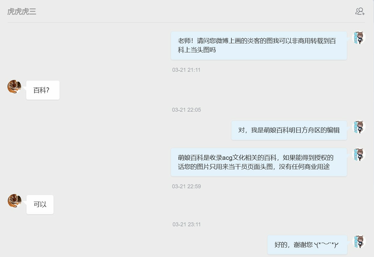 | 虎三 | 虎三的授权图 | 目前仅授权搬运与干员炎客有关的图片。日后如有虎三老师绘制的《明日方舟》新角色的同人画作,须另行取得授权。 |
