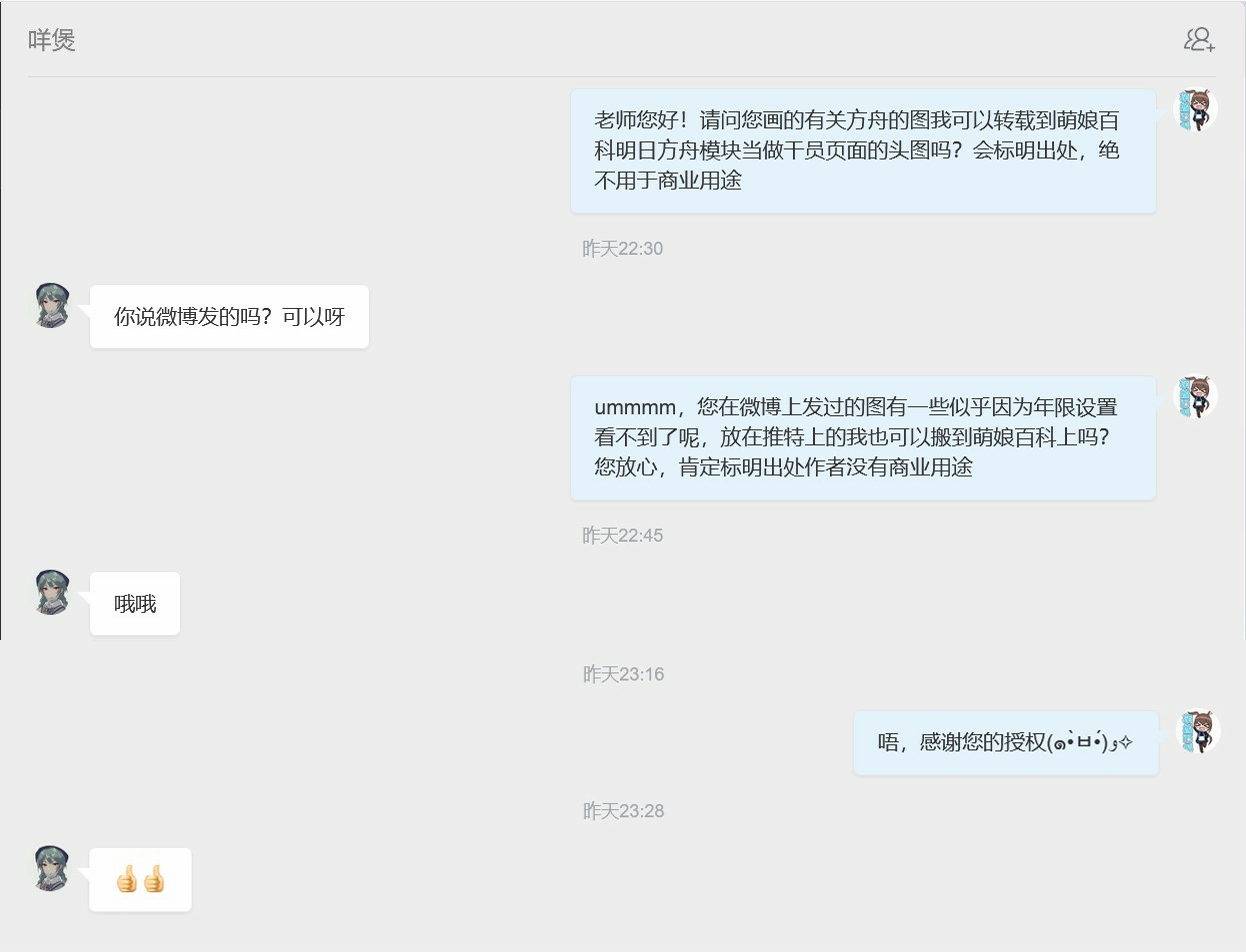 此页面用于记录画师们对萌娘百科非商业性地且标明出处与作者地使用其发布在社交网络平台上的关于《明日方舟》的同人画作的授权情况。